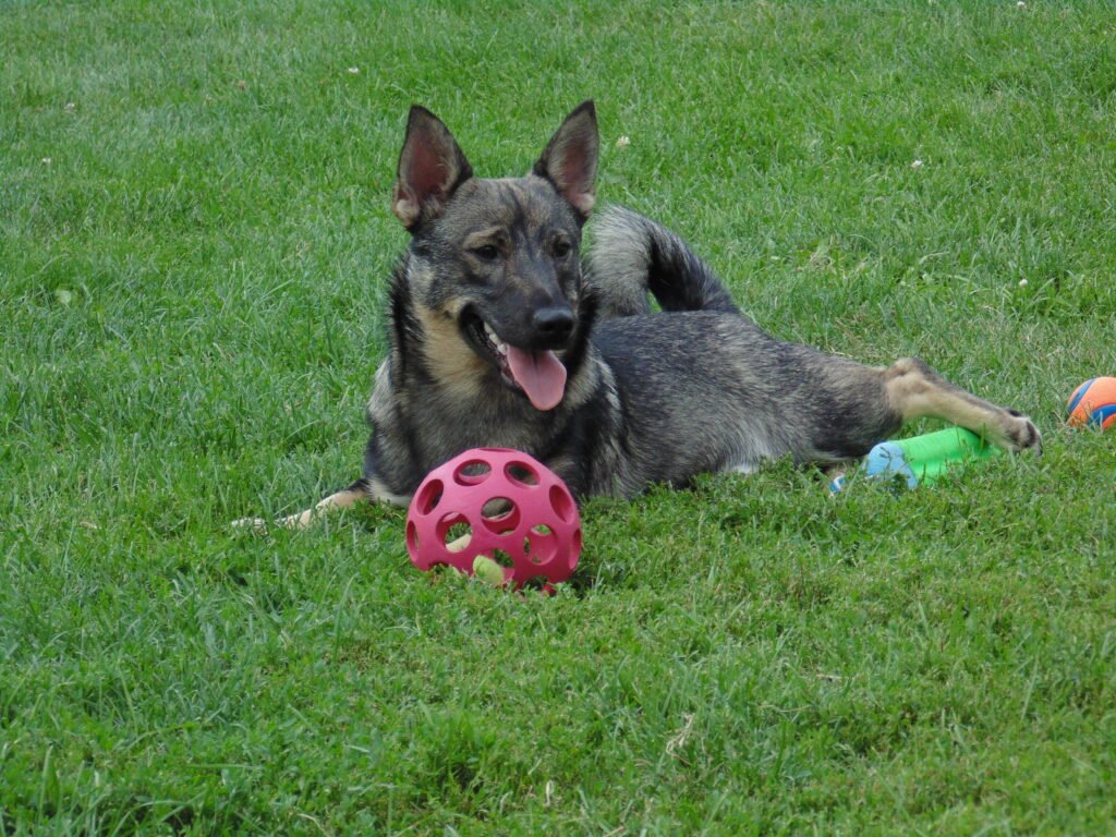 A sable pattern seen in colors of grey through red and combinations of these colors in various shades. All are equally acceptable. Lighter shades of these colors are desirable on the chest, belly, buttocks, lower legs, feet and hocks, with darker hairs on back, neck, and sides of the body. Lighter harness markings are essential. Although a dark muzzle is acceptable, a well-defined mask with lighter hair around eyes, on muzzle and under the throat, giving a distinct contrast to the head color is highly desirable. White is permitted as a narrow blaze, neck spot, slight necklace, and white markings on the legs, and chest. White in excess of one third of the dog’s total color is a very serious fault. Any color other than described above is a very serious fault.